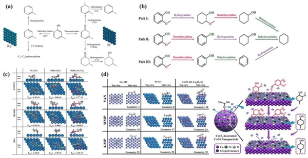 图2 (a)间甲酚在Pt和Ru催化剂表面催化HDO反应路径[115];(b)愈创木酚HDO对CHA的三种可能途径[118];(c)愈创木酚、MOCOL和COL在三个模型表面上吸附构型的优化几何形状[93];(d)优化了V AN、MMP和4-MP的结构,并提出了在CoNi/Al 2 O 3 上V AN HDO的机理