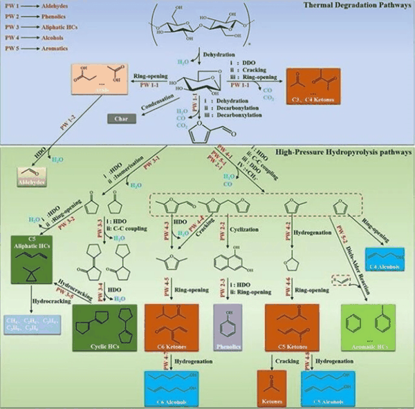 催化加氢脱氧是一种有效且有前景的将生物原油升级为近乎航空燃料的方法。它可以与加氢热解在同一个反应器中进行,也可以依次进行。通过添加氢气和使用适当的催化剂提供足够的氢自由基,以弥补生物质低H/C比的不足,从而抑制了大氧分子和多环芳烃的形成,改善了C -C偶联,最终促进了C8-C16碳氢化合物的生成。