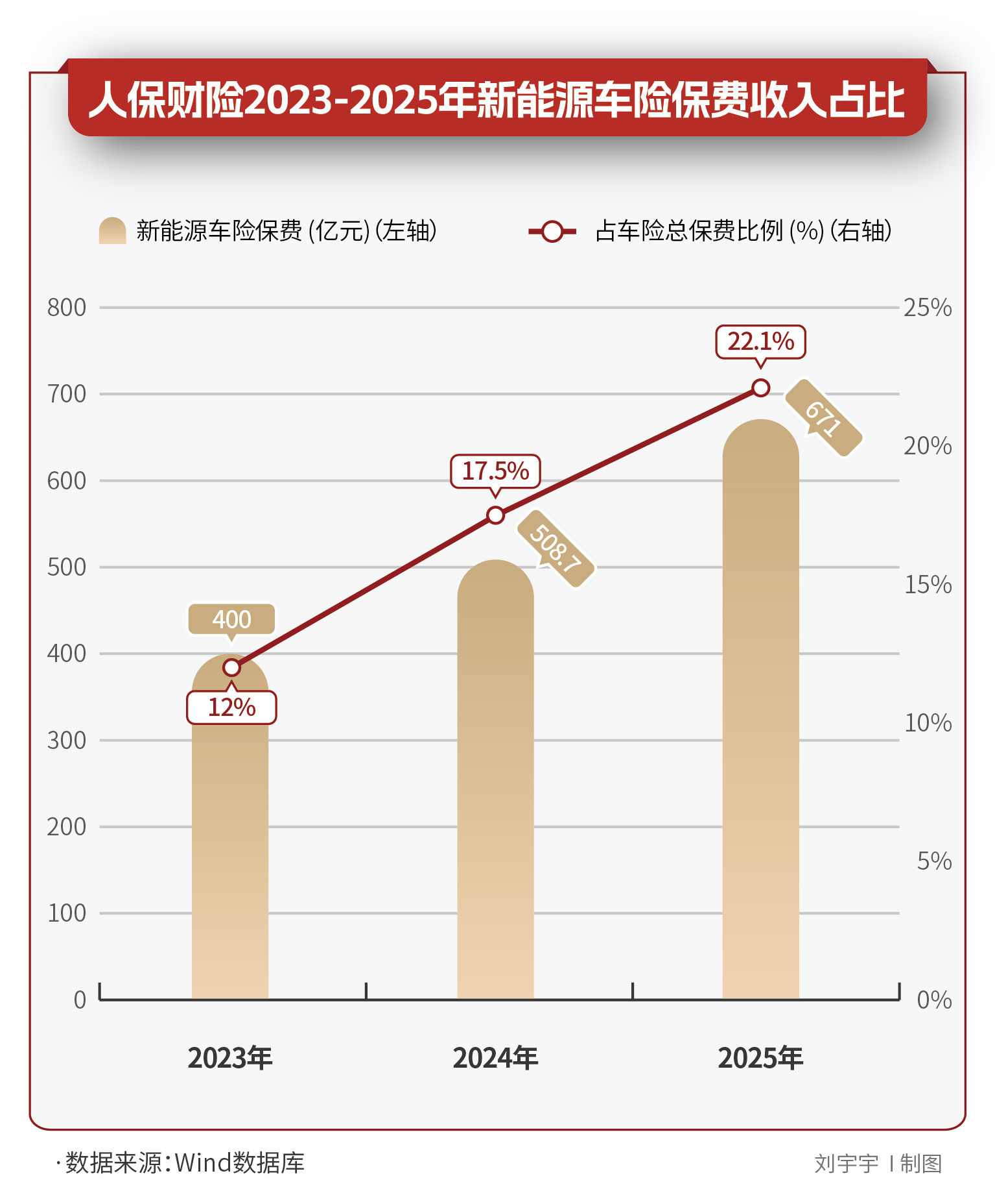 对比发现,2025年,人保财险新能源车险保费收入671亿元,同比增长近32%,占车险总保费比重从17%跃升至22%。与此同时,新能源车险赔付率较上年改善,整体综合成本率( COR )从105%被压降至100%以内,但仍高于燃油车险近6个百分点。
