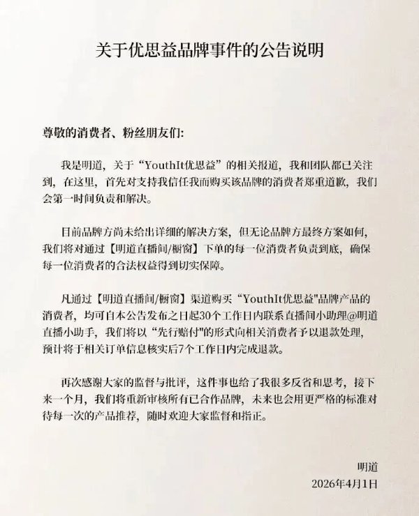 4月1日,演员明道发布关于优思益品牌事件的公告说明,表示自己与团队已关注到关于“YouthIt优思益”的相关报道,“首先对支持我信任我而购买该品牌的消费者郑重道歉,我们会第一时间负责和解决。”