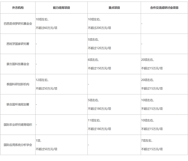 “能力培育项目”旨在支持中外科研人员培育合作关系,可开展包括合作研究、野外考察等多种形式的研究活动。“重点项目”旨在资助中外科研人员在选定领域开展合作研究,共同培养杰出科技人才和解决区域性科学问题,促进提升地区的科研水平与世界影响力。“合作交流项目”旨在支持中外科研人员开展能力建设,可开展包括互访、讲习/培训班等多种交流活动。“研讨会项目”旨在支持中外科研人员召开在华会议及出国会议。