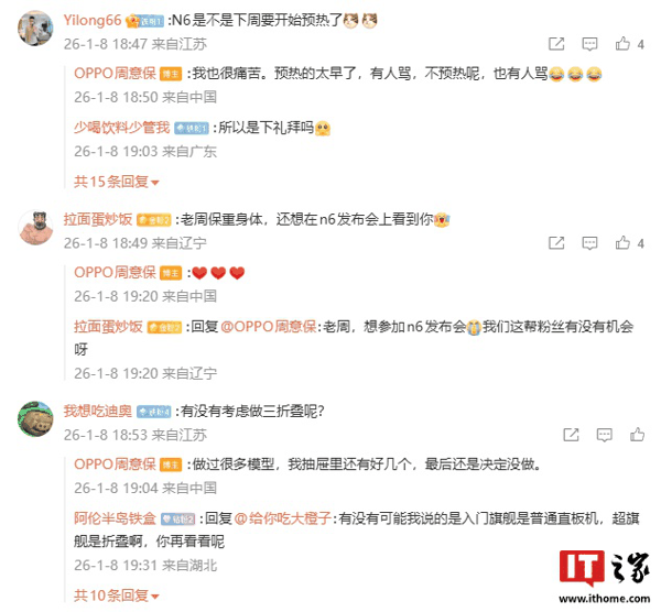 另外,周意保还确认了 OPPO Find N6 手机的存在,这款新机预计将在近期开启预热。据IT之家此前报道,消息称 OPPO Find N6 折叠屏手机搭载骁龙 8 Elite Gen5 处理器,提供北斗卫通版,该机已曝光的配置如下:
