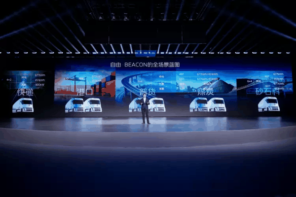 以福田卡文重卡BEACON为例,基于独创的一体化平台,独创跨平台、可拓展、高集成的动力底盘一体化架构,实现氢电共平台与高集成承载。