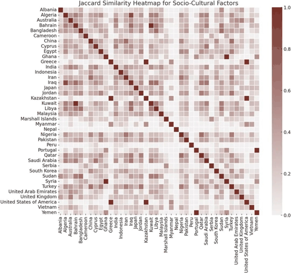 ▲ 图四:基于共同社会文化特征的国家间杰卡德相似度热力图,其中颜色越深表示相似度越高,颜色越浅表示差异越大。©本文作者