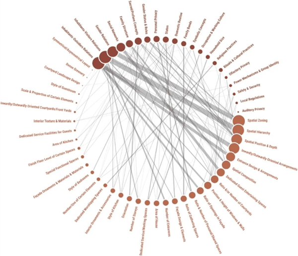 ▲ 图六:文化—住宅研究中的社会空间网络,用以阐释社会文化因素对住宅设计的影响。节点大小代表因素出现频率,线宽代表关联强度。©本文作者