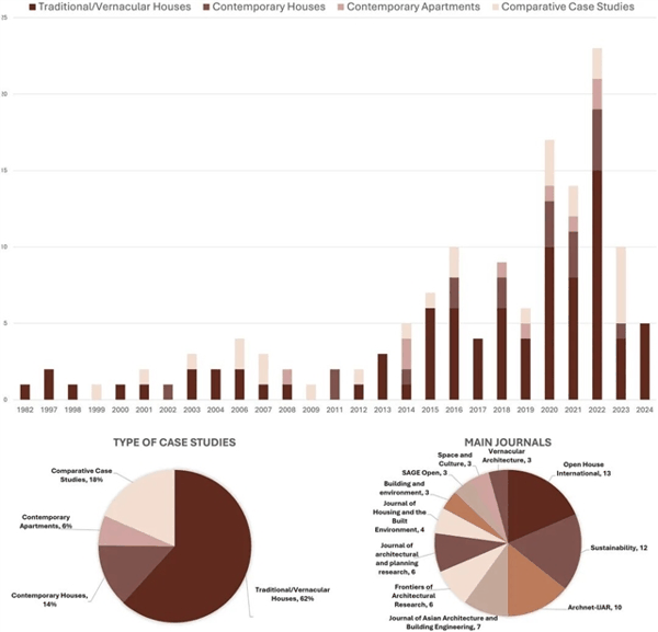 ▲ 图一:按住宅类型划分的文献占比、发表 2 篇及以上文献的期刊,以及按发表年份划分的文献数量。©本文作者