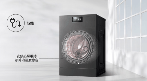 烘干技术更是这款机型的核心优势。区别于主流的冷凝式方案,它采用热泵循环烘干技术:通过压缩机将冷空气转化为热空气,再经抽湿、再热的循环流程,实现低温快速烘干,不仅护衣效果更佳,还能大幅降低能耗。搭配AI 节能模式,机器可根据实际洗护情况智能调节加热器工作状态,进一步节省电费开支。