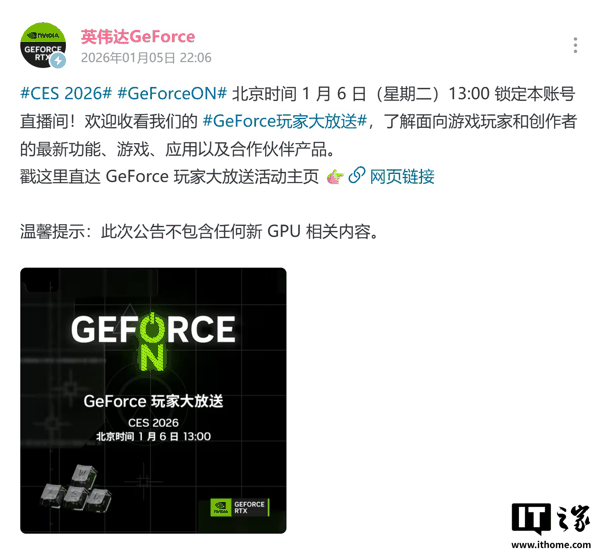 IT之家 1 月 5 日消息,英伟达官方今晚 10 点在B站宣布,CES 2026 期间举办的“GeForce 玩家大放送”活动将在明天(1 月 6 日)13:00 开启。