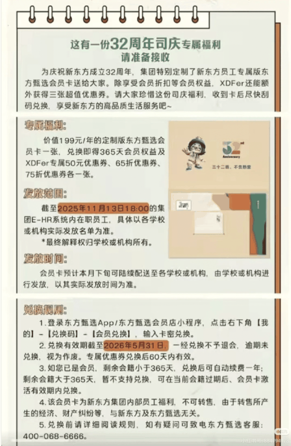 而在公开信发布的前两日,有新东方员工收到通知,32周年司庆专属福利为一张199元的东方甄选会员卡。兑换该会员卡可得到365天会员权益及XDFer专属50元优惠券、65折优惠券、75折优惠券各一张。