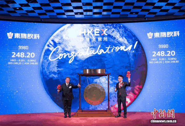 2月3日,中国内地企业东鹏饮料(集团)股份有限公司在香港交易所主板挂牌上市,股票名称为“东鹏饮料”,代码为9980。图为东鹏饮料集团董事长林木勤(右)和品牌代言人韩红共同敲锣上市。 中新社 记者 侯宇 摄