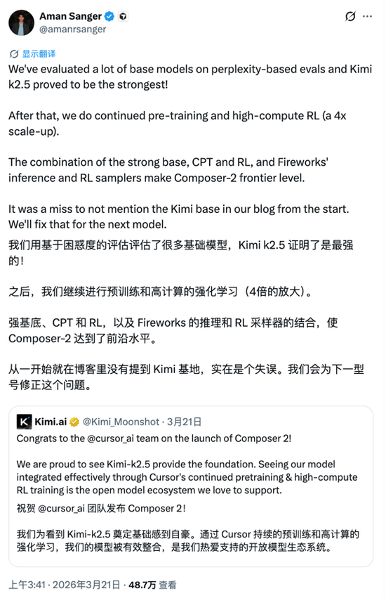 这背后其实是极其理性的“真香”定律。Cursor的联合创始人Aman Sanger说得非常直白:“K2.5被证明是最强的。”Cursor不是没有选择,相反,它主动评估了大量开源基座模型,最终挑中Kimi K2.5,本质上是一场彻底理性的技术决策。