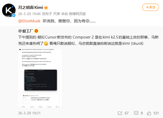 Cursor副总裁被迫承认,公开致歉,承认“疏忽”,Kimi倒也大度,官方账号发帖确认通过第三方授权合作,给足了Cursor面子。同时官方微博还回复了马斯克一句中文歌词:“听我说,谢谢你,因为有你……”