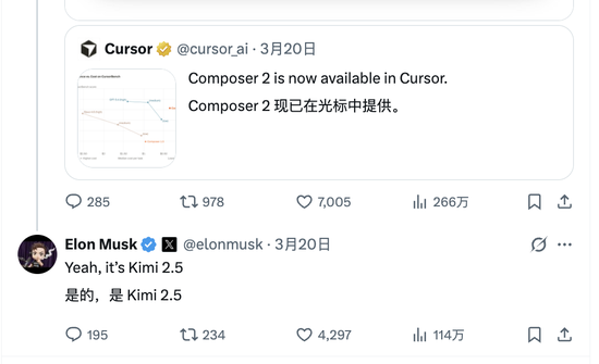 真正把这场风波推上高潮的,是埃隆·马斯克在社交平台上亲自下场“实锤”:“是的,这就是Kimi 2.5。”