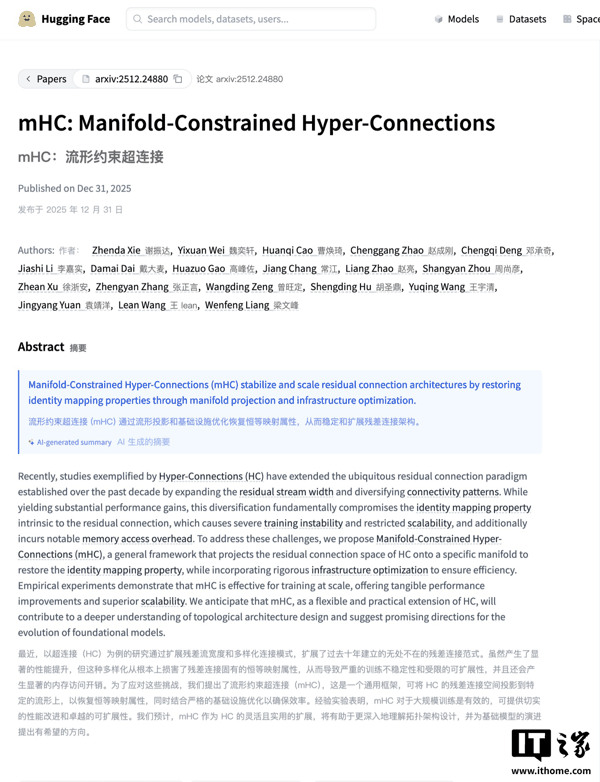 IT之家 1 月 1 日消息,北京时间今天下午,DeepSeek 公布了一篇新论文,提出名为 mHC (流形约束超连接)的新架构。根据介绍,该研究旨在解决传统超连接在大规模模型训练中的不稳定性问题,同时保持其显著的性能增益。