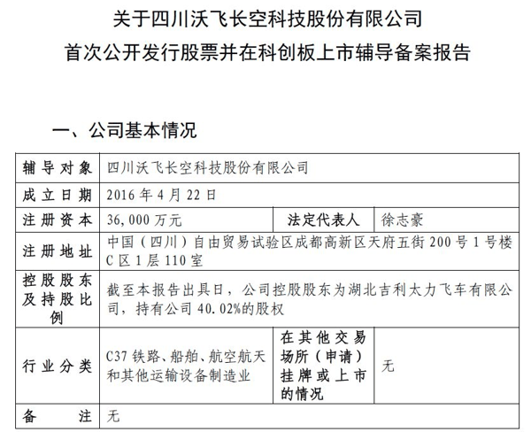 公开资料显示,成立于2016年的沃飞长空,是吉利控股集团旗下致力于低空出行的科技公司。在启动上市辅导前,沃飞长空刚完成了一系列密集的资本与股权动作,包括完成股改,以及一笔近10亿元的融资。