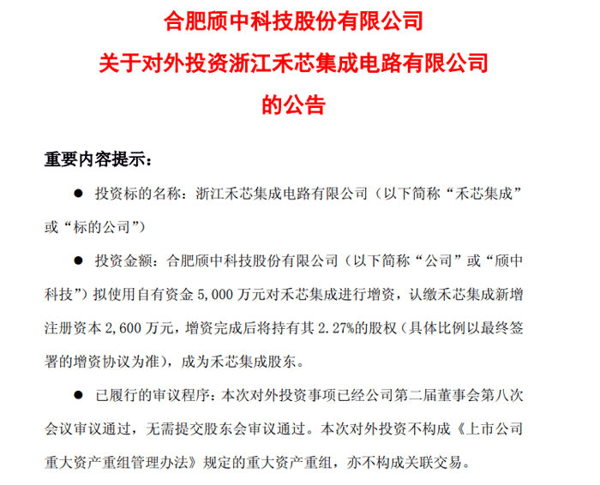 2026 年 1 月 19 日,合肥颀中科技股份有限公司发布公告,宣布拟以自有资金 5000 万元对浙江禾芯集成电路有限公司(以下简称 “禾芯集成”)进行非同比例增资,认缴其新增注册资本 2600 万元,增资完成后将持有禾芯集成 2.27% 的股权(具体比例以最终签署的增资协议为准),正式成为其股东。