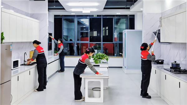 以新启用的西南培训基地为例,基地内1:1还原真实工作场景,设有卧室、厨房、浴室等特色教学区,开设涵盖日常保洁、家电清洗、洗衣洗鞋、烹饪小时工等全品类家政实操课程。