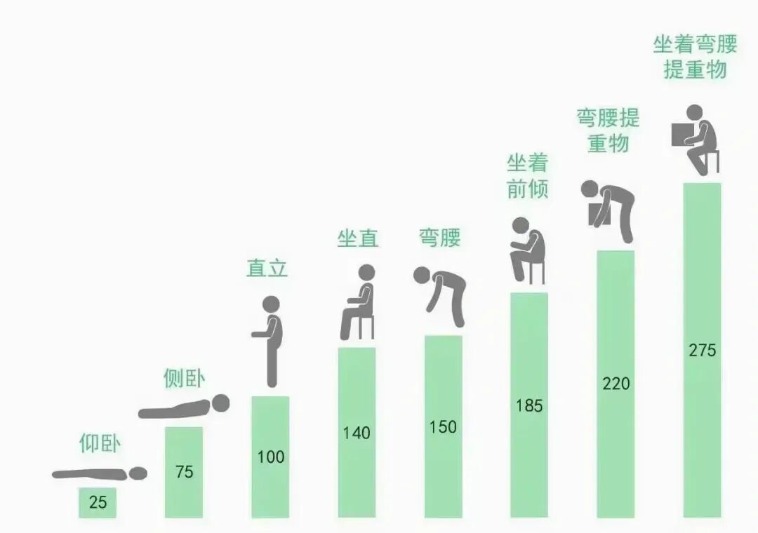 徐文斌算过一笔账。直立行走时,脊柱承受的负荷是100%。微微前倾,压力升到150%;坐姿不正,高达185%;弯腰搬重物时,甚至逼近220%。只有在侧躺(75%)和平躺(25%)时,脊柱才能真正放松。