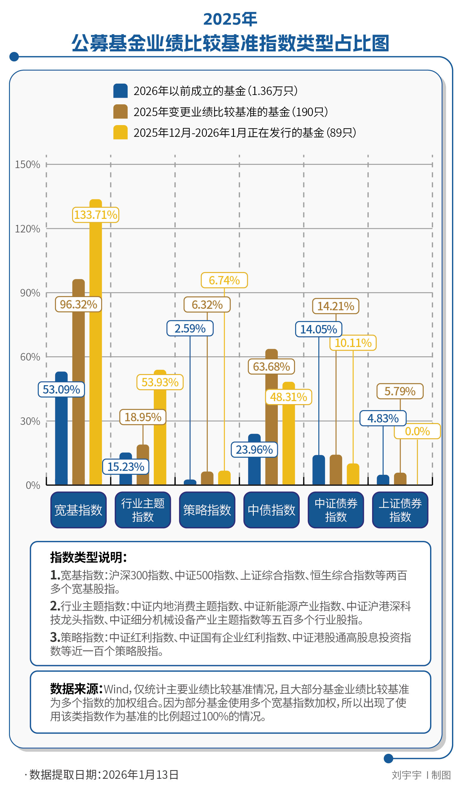 为厘清全市场业绩比较基准的整体取向,南方周末新金融研究中心对全市场超1.3万只基金的业绩比较基准进行了全面统计与系统梳理 (详见下图) 。结果显示,随着业绩比较基准相关规定的陆续出台,无论是已完成基准变更的老基金,还是当前正在发行的新基金,均更倾向于选取宽基指数、行业主题指数和中债指数等更加适配各类型基金投资方向的主流指数。由此可见,基金业绩比较基准的规范化、精准化转型已成为明确的行业趋势,基准与基金投资方向的适配性正持续提升。