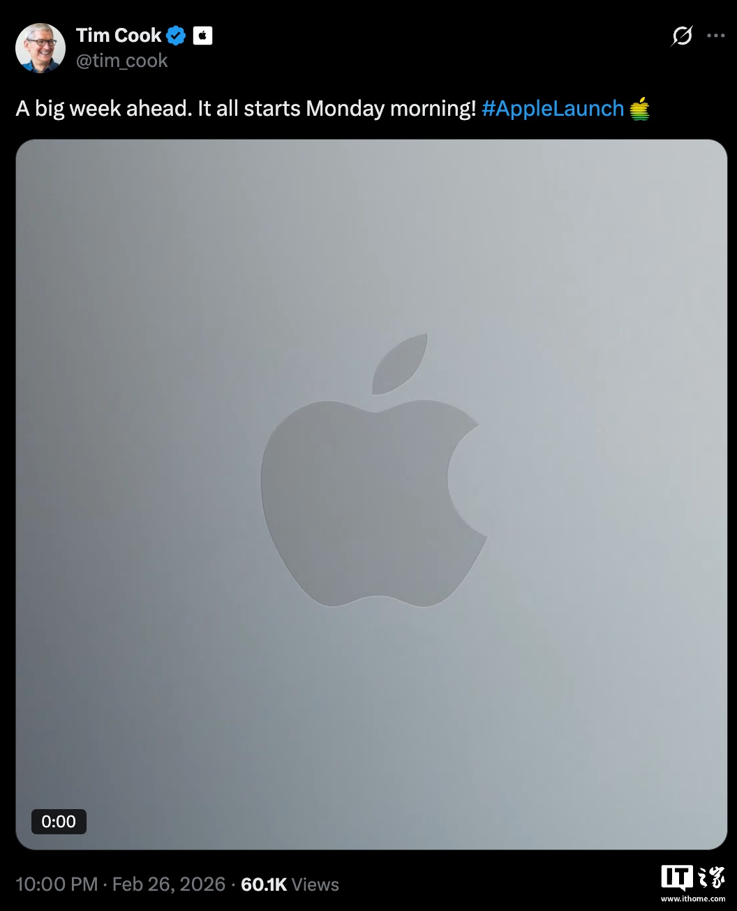 库克在X平台暗示苹果将从3月2日起陆续推出新品,预计为平价MacBook/iPhone 17 e等