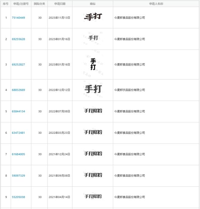 记者在国家知识产权局商标局搜索发现,今麦郎注册了多个“手打”字样的商标,并注册了“手打鲜粉”“手打先生”“手打师傅”“手打面”等商标。此外,天眼查显示,今麦郎还申请了“一桶半”“一袋半”等易引发歧义的商标,不过多被裁定无效。