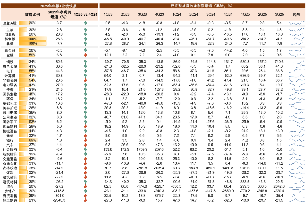 行业层面,盈利改善行业有望增多。非银持续受益于较高的市场活跃度,非金融领域 有色金属 、科技继续担当结构亮点, 钢铁 、 电力 设备等板块盈利改善。依据目前已经披露2025年年报或业绩快报的上市公司数据,31个一级行业中,18个行业2025年盈利增速较2024年改善,占一半以上。其中, 钢铁 、 有色金属 、 电子 、 计算机 、 非银金融 、 电力 设备、 传媒 、 医药生物 、 环保 、 基础化工 等行业盈利同比增速较高, 轻工制造 、 商贸零售 、 房地产 、 建筑材料 、 建筑装饰 、 煤炭 等行业盈利同比降幅仍较大。具体来看:1)上游部分,金价上涨和反内卷带动部分行业边际改善。2025年在外部不确定性扰动下,金价持续上涨,带动 有色金属 板块盈利上行。低基数和反内卷带动 钢铁 和化工板块盈利修复,钢铁受益于原料成本下降,化工产能周期位置也接近拐点。2)中游部分,外需和反内卷相关领域韧性较强,地产和消费相关领域仍待修复。2025年我国出口在不确定中展现韧性,家电和 新能源 等相关产业受外需支撑。此外, 电力 设备板块中,光伏受益于反内卷,储能受益于需求高景气。随着 房地产 量价持续弱势, 建筑装饰 、 建筑材料 盈利表现偏弱。与地产和消费关联度均较高的 轻工制造 盈利降幅较大。3)下游部分,消费板块整体仍待改善。2025年下半年社零增速在以旧换新政策退坡后逐步回落, 商贸零售 、 农林牧渔 、 纺织服饰 盈利降幅较大。4)TMT部分,AI产业趋势持续支持需求增长。AI需求压缩消费级存储产能,拉动2025年下半年以来存储价格快速上行,同时海外AI相关需求旺盛, 电子 板块盈利持续高增, 计算机 板块盈利回暖。后续我们将持续关注业绩披露情况。