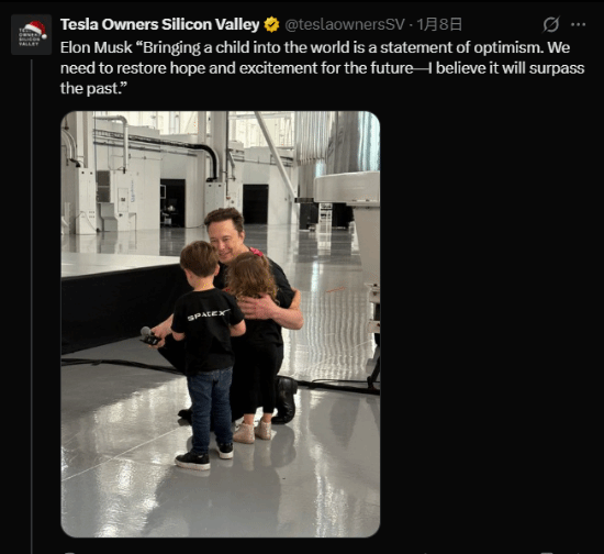 近日,科技频道Tesla Owners Silicon Valley分享了一张马斯克与这对双胞胎的合影,并配上了马斯克的一句话——称生孩子是“一种对未来的乐观宣言”。随后,马斯克在评论区亲自现身,解释了孩子名字背后的含义。