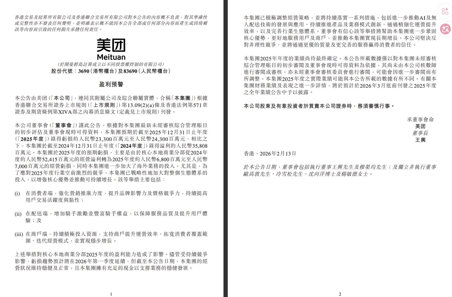 IT之家 2 月 13 日消息,美团今日在港交所公告,根据对集团最新未经审核综合管理账目的初步评估及董事会现时可得资料,预期于截至 2025 年 12 月 31 日止年度录得 亏损约人民币 233 亿元至人民币 243 亿元 ,相比之下,美团 2024 年度录得溢利约人民币 358.08 亿元。