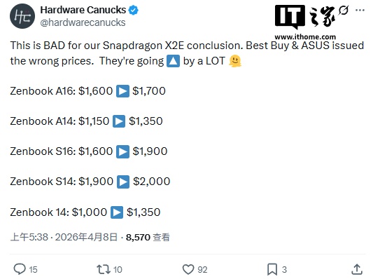 IT之家 4 月 8 日消息,高通新一代骁龙 X2 Elite 系列芯片昨日正式解禁,华硕也在同一天发布了基于高通、英特尔和 AMD 芯片的多款笔记本电脑新品。然而仅一天后,华硕就通过 Best Buy 进行了涨价。