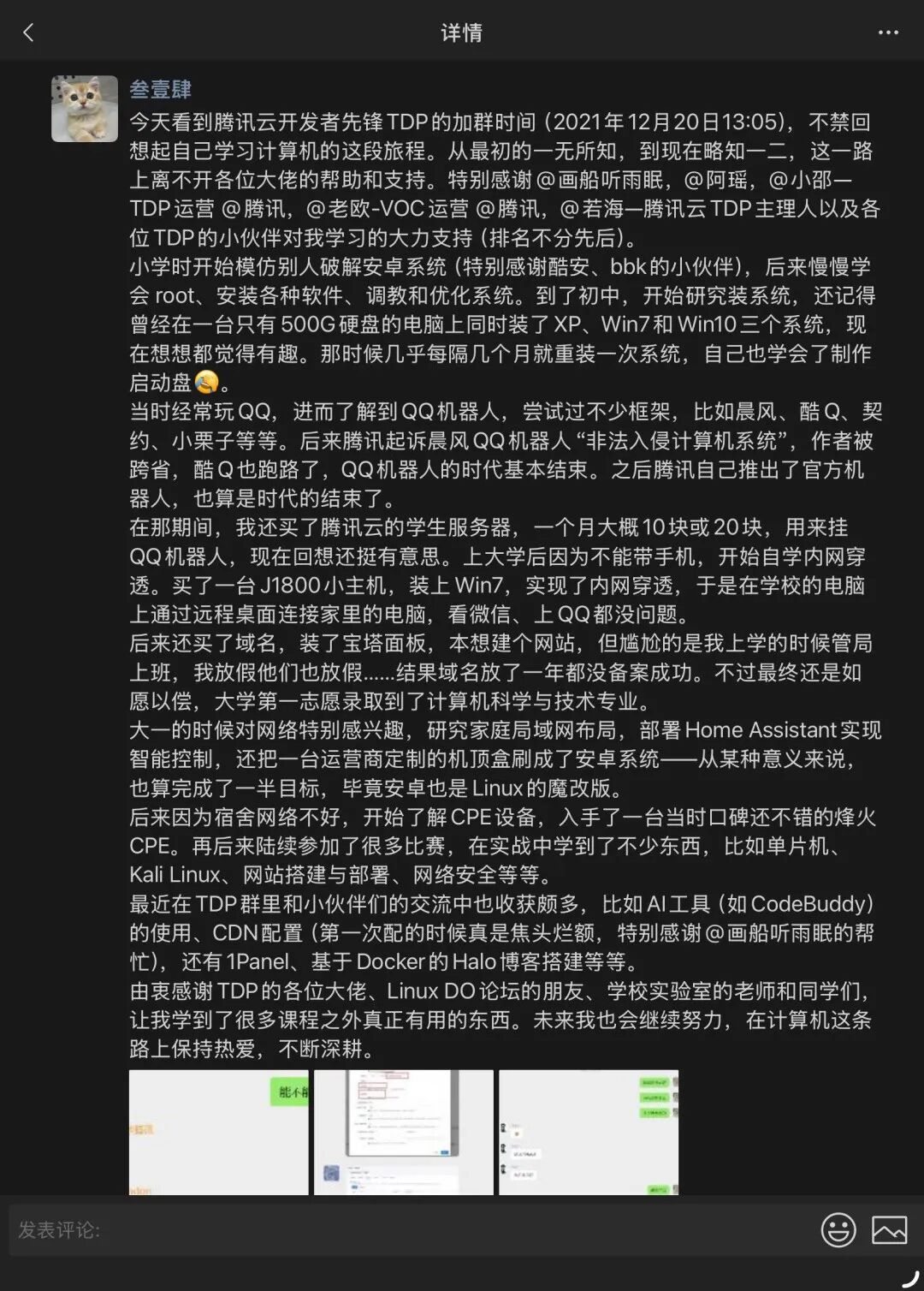 或许是服务器足够稳定,“腾讯云”这个词语在小金过去的成长经历里不算起眼。直到大学时期,TDP群聊从一众屏蔽列表里被小金移出,成为他的每日必看,小金的成长历程和这条线索的交汇也逐渐明晰。