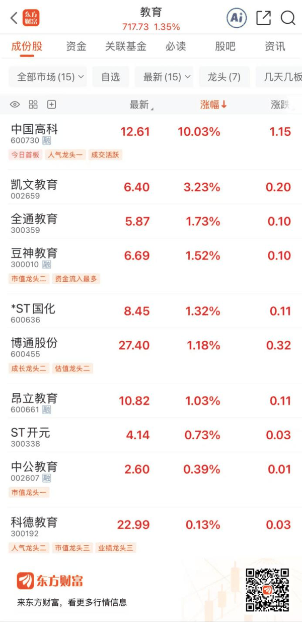 11月28日,A股“AI+”的风吹到了 教育 。截至早间收盘, 教育 板块上涨1.35%,涨幅在两市行业板块中位居前列。个股方面, 中国高科 涨停, 凯文教育 涨超3%, 全通教育 、 豆神教育 、 *ST国化 、 博通股份 、 昂立教育 等多股涨超1%。