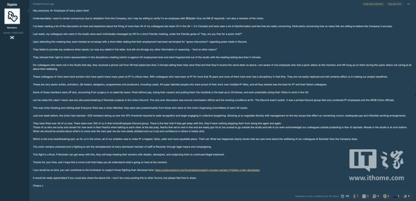 他在文中透露,公司的人事(IT之家注:HR)上周给还在办公室的同事发送了一则看似友好的消息,说要“简单聊一聊”,但当他们走进会议室时,HR 递给他们一封信, 上面写着他们在 Discord 上的发言构成“严重不当行为” , 即刻被解雇 。