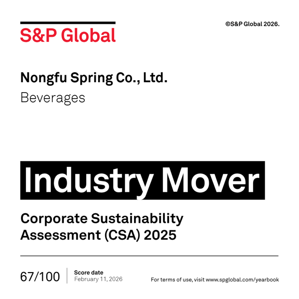 2月18日, 标普全球 (S&P Global)正式发布2026年《可持续发展年鉴》(下称“全球版《年鉴》”), 农夫山泉 凭借在环境、社会及公司治理(ESG)方面的优秀表现入选,位列全球饮料行业第十名并荣膺“行业最佳进步企业”称号。此前, 农夫山泉 已连续三年入选 标普全球 《可持续发展年鉴(中国版)》。