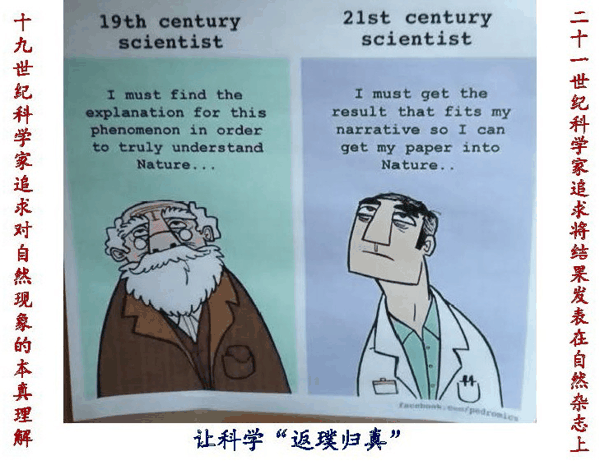 此外,从上下联中设计的人物头像也可以看到一点有意思现象。上联似乎是一个戴着一副老花镜的富态老年科学家形象,它刻画了19世纪能够凭兴趣“做自己的科学研究”的人中也许有一些来自皇家贵族,他们衣食无忧,可以心无旁骛,苦苦探索,不急功近利,可以做到“十年磨一剑”。为此,上联体现了那个时代随心所欲地做纯粹的科学研究,他们可以对一些自然现象追根溯源,从而创造出一些改变人们生活方式的重大原创成果。然而,21世纪用了一个相对年轻人的头像。他象征年轻人虽然朝气蓬勃,思想前卫,处于创造力旺盛时期,然而容易浮躁,急功近利,导致当下学术界出现一些背离科学精神,给纯粹科学研究环境带来冲击。例如一味追求将成果发表在高影响因子刊物上,尤其是自然杂志。其实按照科学共同体成果认定的约定俗成规则,任何科学技术成果只要发表在公开的学术刊物就拥有了成果发明的优先权,与期刊“档次”无关。同时一项成果的科学水平也不能简单以发表的期刊决定,而是成果本身水平。这就需要科学同行评价,而不是由外行“数数评价”决定。我曾经在文章中提到,我国地球物理勘探领域马在田先生的标志性成果(也是他获批中国科学院院士的代表性成果)是发表在国内行业刊物“石油地球物理勘。”我们可以发现,在科学史上一些推动人类进步,改变人们生活方式的重大科技成果并不全都发表在我国学术界推崇的两个“顶刊”及高影响因子期刊上。为此,我给这副图片加的横批是“让科学返璞归真。”