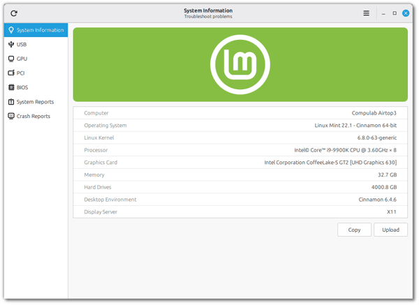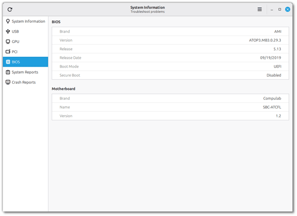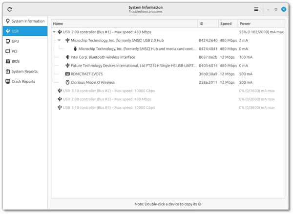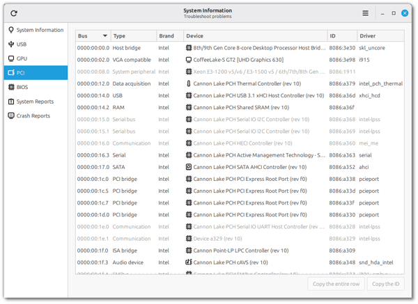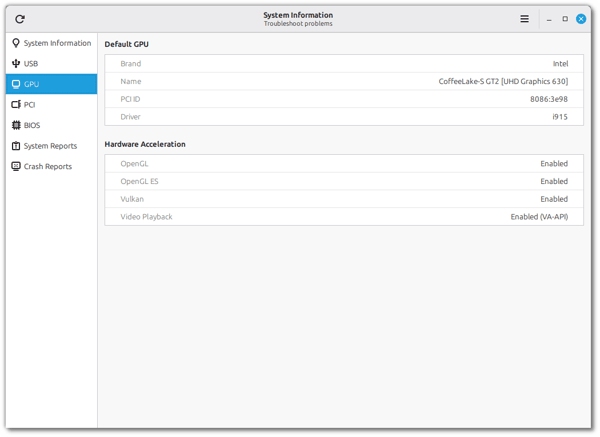 系统按钮放置在侧边栏中 10 月另一个亮点是故障排查能力,开发团队改造原有的“系统报告”(System Reports)工具,并将其更名为“系统信息”(System Information), 整合了 USB、GPU、PCI 和 BIOS 四个全新的信息页面。