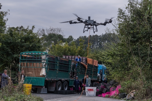 四川蒲江:采摘旺季山区果农用无人机转运耙耙柑下山