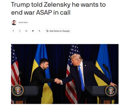 美乌元首通话:泽连斯基希望年内结束冲突,特朗普称“一个月内”