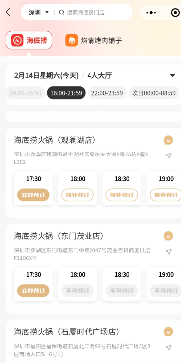 另外,除了“年夜饭”就餐需求,不少大城市仍保持了较旺盛的普通就餐聚会需求。比如,2月14日是本次春节长假前夕的最后一个工作日,记者当天下午在 海底捞 小程序发现,当天一些大城市的不少门店晚高峰时段4人位的就餐预订已满,需要候补预订,但不能保证候补成功。