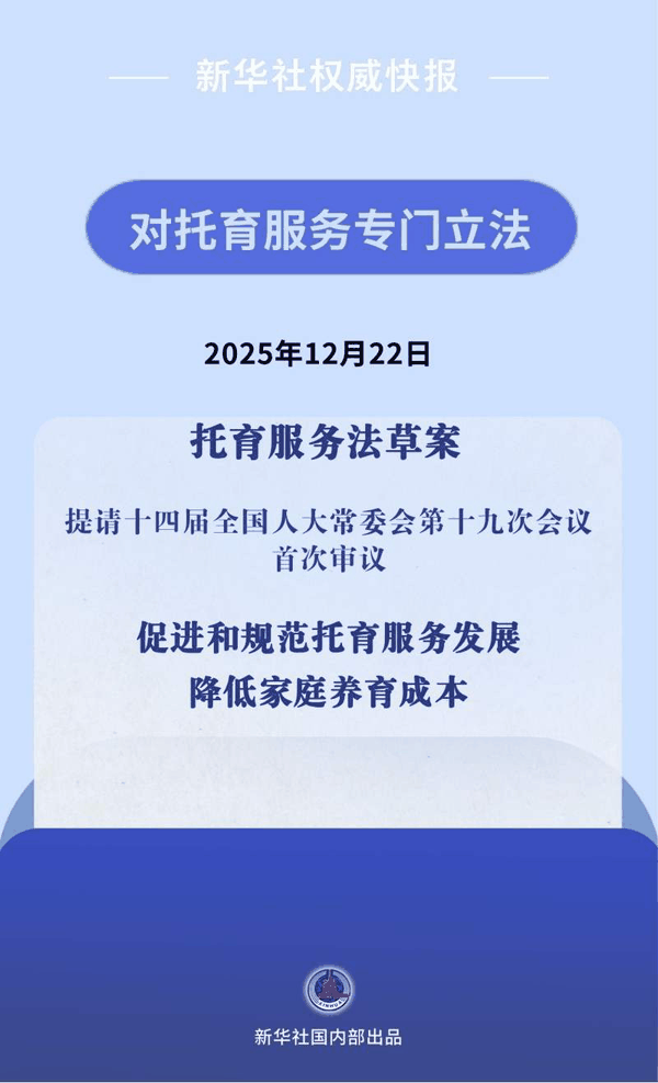 据新华社消息,12月22日,托育服务法草案提请十四届全国人大常委会第十九次会议首次审议。草案共8章76条,包括总则、托育机构、托育人员、服务提供、保障措施、监督管理、法律责任和附则。