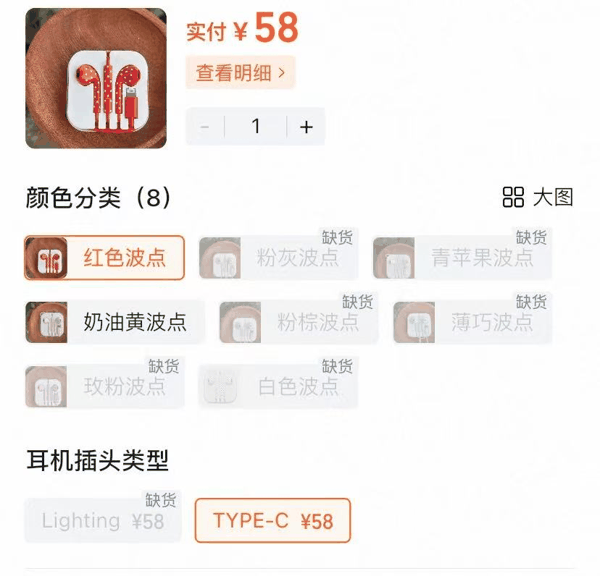 界面新闻记者在淘宝平台上按着销量搜索发现,包括倍思等品牌有线耳机销量都在上万,价格在十几元到几十元不等。另外,受到年轻人追求时尚、个性化需求的影响,一些色彩丰富、具有设计元素的有线耳机也受到欢迎。比如一款售价58元的波点有线耳机,销量超过了千人,具体页面显示除了红色波点、奶黄色波点款式外,其他配色均已缺货,客服回复暂时不确定什么时候能补货。