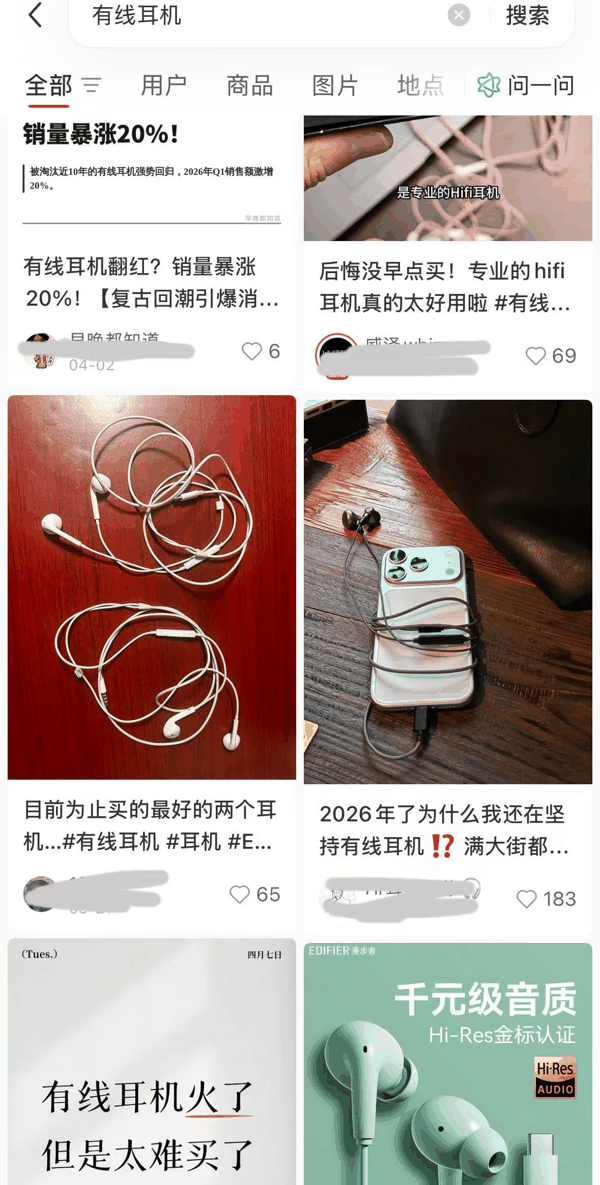 4月10日,界面新闻记者查询社交平台发现,有不少“求有线耳机推荐”、“有线耳机使用心得”、“有线耳机销量暴涨”的帖子。“20元老古董有线耳机销量暴涨、吊打千元无线”的话题引发热议。