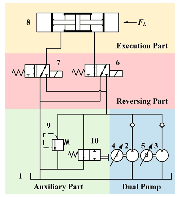 为从根本上突破传统“单泵-单缸”系统因主泵流量能力限制而导致的启动响应慢的瓶颈,本文提出了一种系统级优化方案。如图1所示,该系统在保留原有大排量主泵的基础上, 并联引入了一个小排量辅助泵 ,形成了“双泵-单缸”的供油架构。
