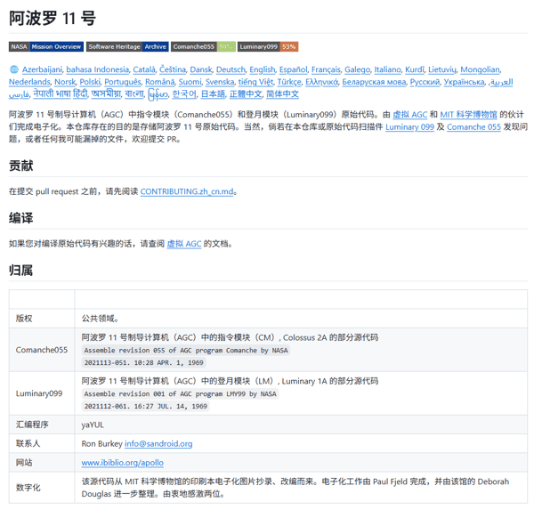 据 TomsHardware 今日报道,NASA 宣布已将阿波罗 11 号当年所使用的计算机软件代码开源并划归公共领域(实际上早已上传到 GitHub );提供简体中文等数十种语言的自述文件;任何人都可以阅读、下载、修改。