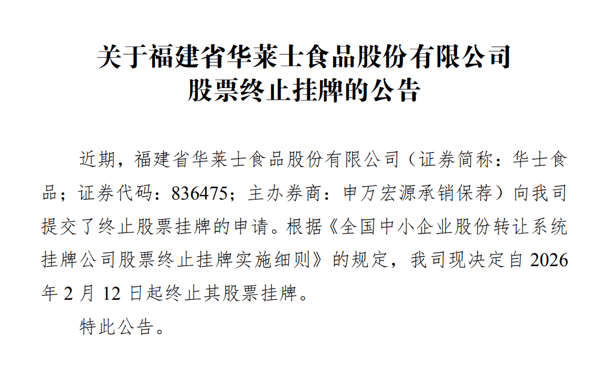 2月12日,华莱士母公司华士食品正式终止在新三板挂牌。