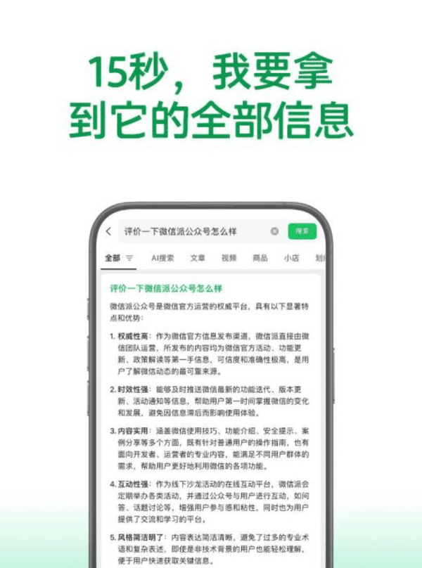 点击微信搜索栏输入“评价一下 XX 公众号怎么样”,微信 Al 搜索即可基于账号相关文章,提炼出系统性总结。