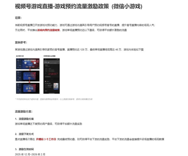 为助力小游戏开发者做好视频号直播内容经营,平台重磅推出游戏预约流量激励政策。开发者可在游戏中通过道具激励引导用户预约官方直播,单场直播预约人数达到一定量级后,平台将额外奖励流量,单场最高激励可达 200 万流量。