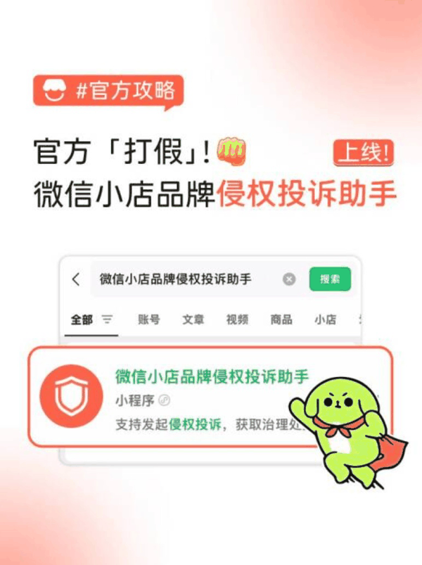 平台对假货进一步重拳出击,品牌权利人通过新上线的微信小店品牌侵权投诉助手,仅需两步即可对假冒商品发起投诉:第一步,品牌入驻;第二步,提交侵权投诉后,平台会进行专项队列审核。