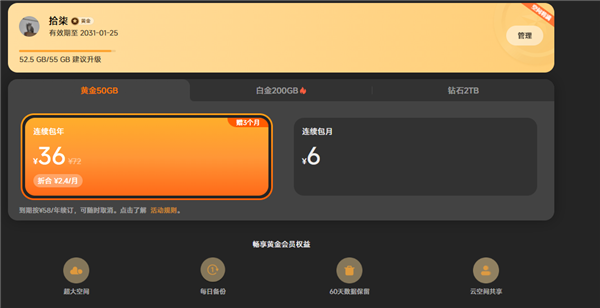 黄金50GB连续包年: 36元,折合每月约2.4元;