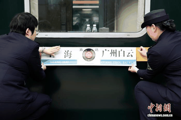 列车长李喆(右)与同事一起更换方向牌。 中新网 记者 殷立勤 摄