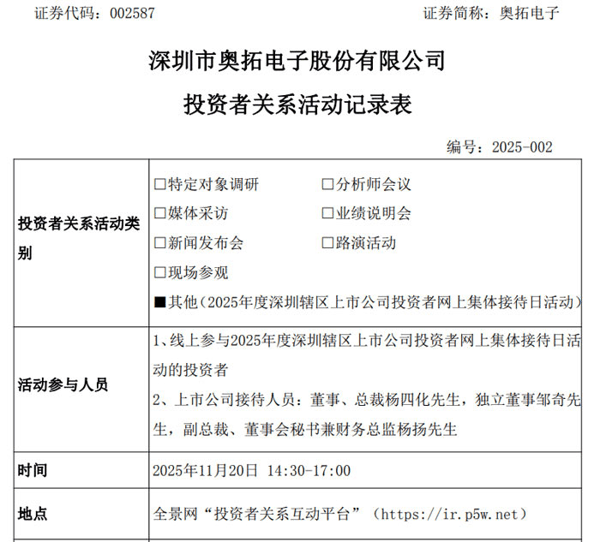 2025 年 11 月 20 日,深圳市奥拓电子股份有限公司(证券代码:002587)参与 2025 年度深圳辖区上市公司投资者网上集体接待日活动,通过全景网 “投资者关系互动平台” 与广大投资者展开深入交流。公司董事、总裁杨四化,独立董事邹奇,副总裁、董事会秘书兼财务总监杨扬等核心管理层出席活动,全面回应了市场关切的战略布局、业务进展、订单情况及市值管理等核心问题。